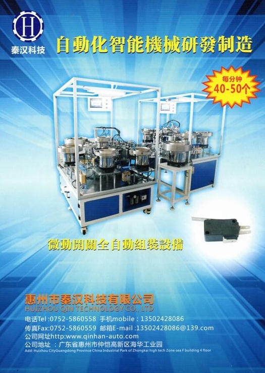 惠州市秦漢科技有限公司:坐落于美麗的惠州市仲愷高新技術(shù)產(chǎn)業(yè)開(kāi)發(fā)區(qū),是以電子行業(yè)、汽車(chē)行業(yè)、家用電器行業(yè)的開(kāi)關(guān)類(lèi)自動(dòng)化組裝及檢測(cè)應(yīng)用為主導(dǎo)產(chǎn)品的新興科技型自動(dòng)化設(shè)備生產(chǎn)企業(yè),公司先后取得二十多項(xiàng)發(fā)明和實(shí)用新型專(zhuān)利,并獲得國(guó)家高新企業(yè)認(rèn)可。