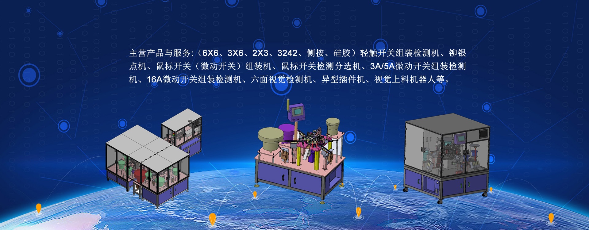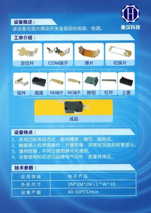公司主營(yíng)產(chǎn)品與服務(wù): (6X6、3X6、2X3、3242、側(cè)按、硅膠)輕觸開(kāi)關(guān)組裝檢測(cè)機(jī)、鉚銀點(diǎn)機(jī)、鼠標(biāo)開(kāi)關(guān)(微動(dòng)開(kāi)關(guān))組裝機(jī)、鼠標(biāo)開(kāi)關(guān)檢測(cè)分選機(jī)、3A/5A微動(dòng)開(kāi)關(guān)組裝檢測(cè)機(jī)、16A微動(dòng)開(kāi)關(guān)組裝檢測(cè)機(jī)、六面視覺(jué)檢測(cè)機(jī)、異型插件機(jī)、視覺(jué)上料機(jī)器人等。